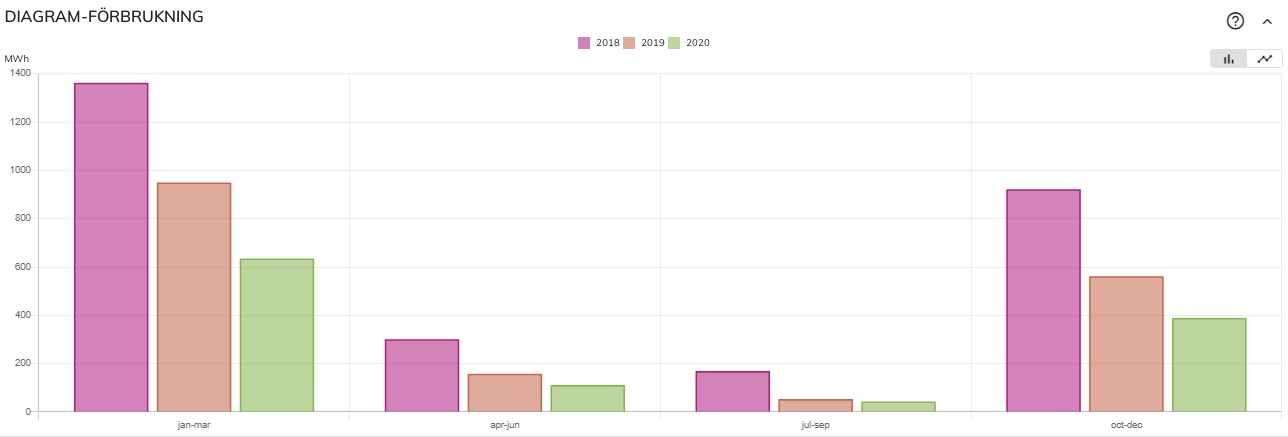 Nedan följer en bild på hur det brukar se ut när vi har projekterat och utfört ett energiprojekt, från ax till limpa. Diagrammet visar fjärrvärmeförbrukningen i en fastighet som vi energioptimerade och driftsatte våra förändringar under i december 2018.